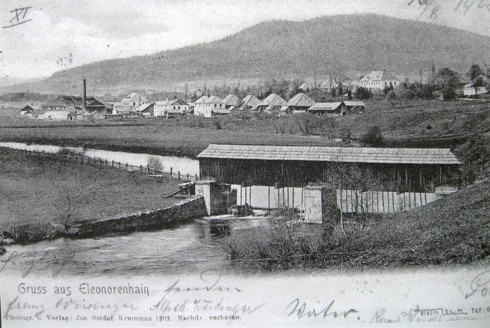Lenorskou sklárnu založil Jan Meyer v roce 1834, nejmladší ze synů Josefa Meyera, který převzal v roce 1829 sklárnu ve Vimperku. Když nestačil pokrýt poptávku po svém zboží, začal přemýšlet o stavbě nové sklárny. Vybral pro ni místo v zátoňském revíru pod Boubínem, na jihozápadním svahu lesa Ptáčník při řece Vltavě. Postavená sklářská huť byla pojmenována po Eleonoře, manželce majitele panství Jana Adolfa Schwarzenberka, Eleonorenhaim, v českém překladu znamená tento výraz „Eleonořin háj“. Později vyl název sklárny a obce počeštěn do nynější podoby.