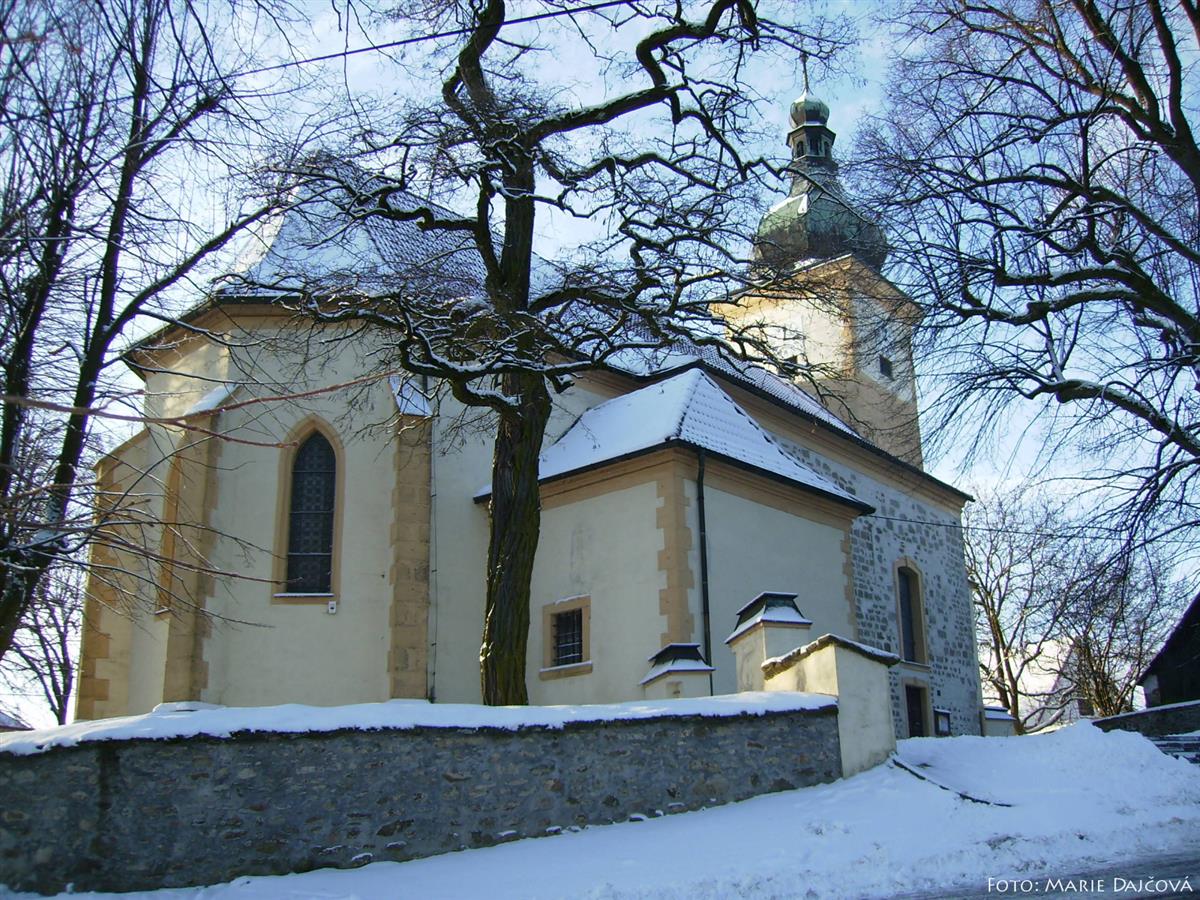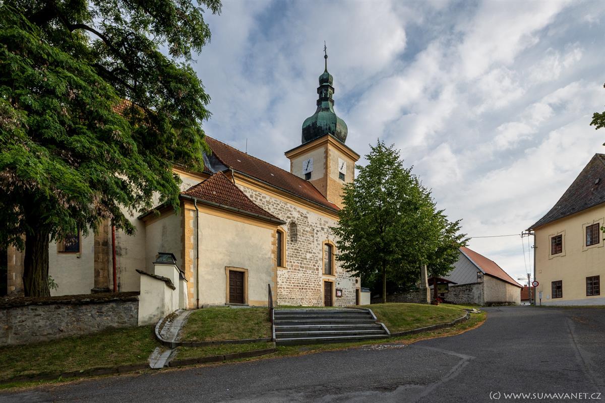 Kostel původně románský z počátku 13 století (jádro lodi a věže), později byl goticky upraven. Barokní přestavba byla završena v roce 1730. Zjištěny zbytky původních maleb z XV. stol. Obnovena malba v presbytáři, představující gotický oltář se sedmi věžemi, se skutečným výklenkem zvaným sakrárium, tj. místo pro odložení náboženských nádob.