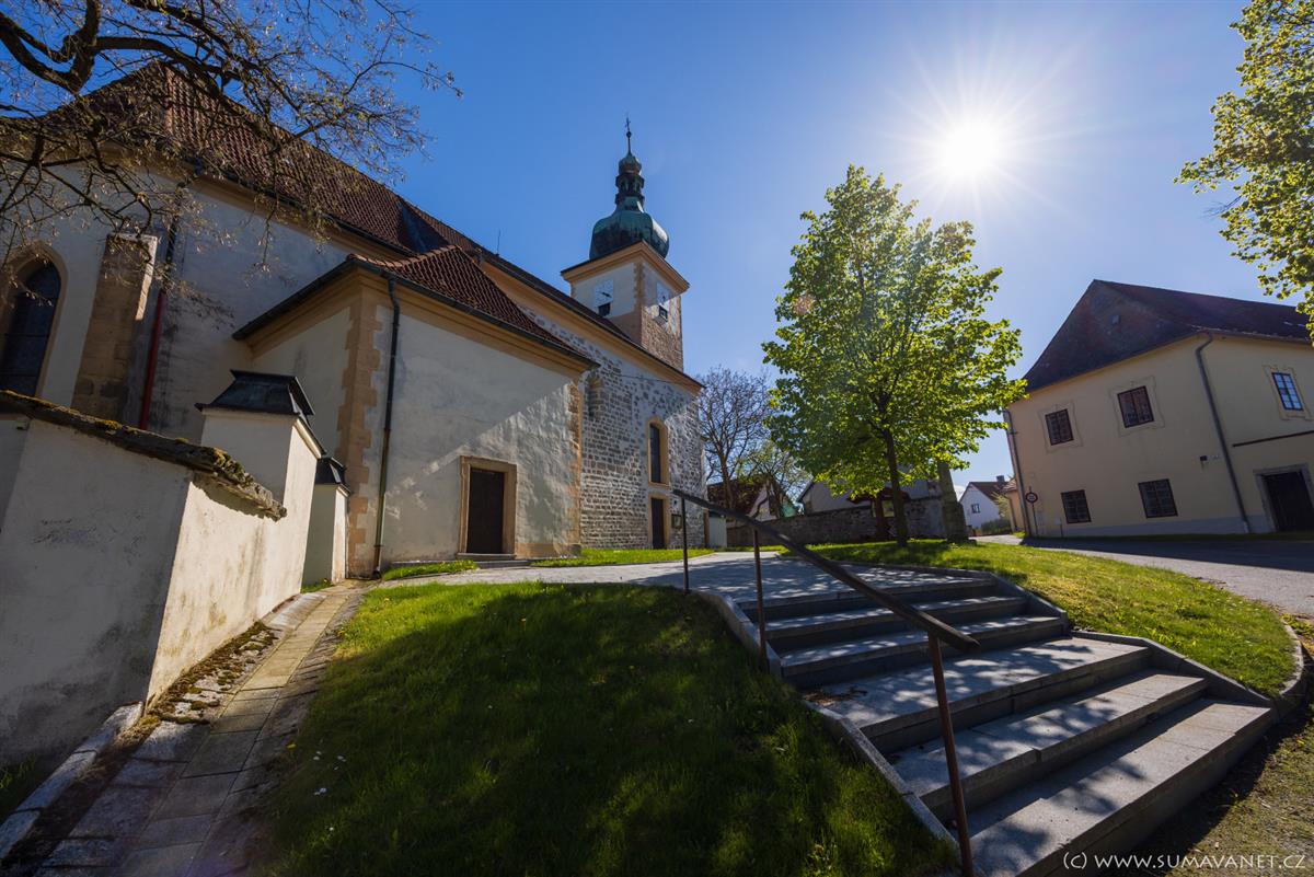 Kostel původně románský z počátku 13 století (jádro lodi a věže), později byl goticky upraven. Barokní přestavba byla završena v roce 1730. Zjištěny zbytky původních maleb z XV. stol. Obnovena malba v presbytáři, představující gotický oltář se sedmi věžemi, se skutečným výklenkem zvaným sakrárium, tj. místo pro odložení náboženských nádob.