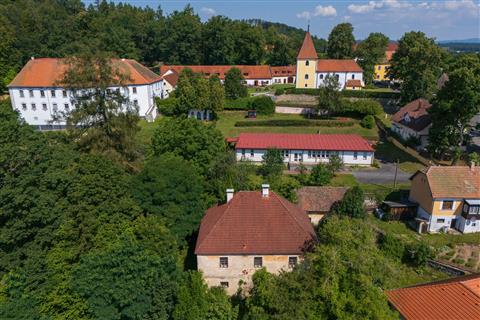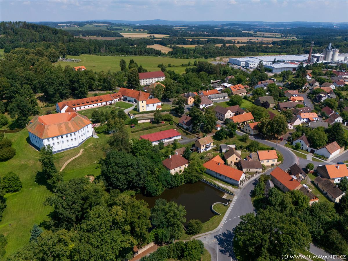 V těsné blízkosti zámku stojí kostel Povýšení sv. Kříže, barokní stavba z let 1751–1764, která částečně zachovává prvky původní gotické svatyně. Náves se středovým rybníkem obklopují historické usedlosti, mezi nimi vyniká č.p. 46 s typickou trojdílnou dispozicí a klenutou bránou. Památkově cenné jsou i domy č.p. 8, 20, 23–27.