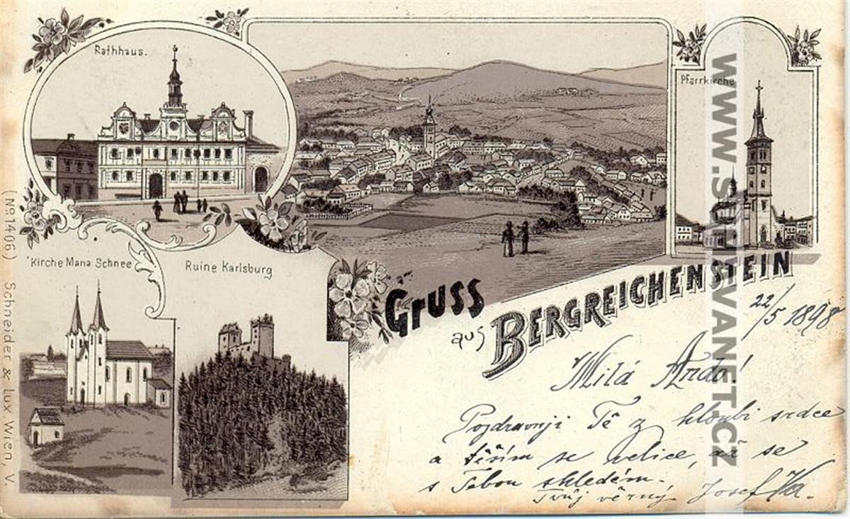 Kašperské Hory (740 m) - přirozené středisko střední Šumavy, město v horské poloze na jižním svahu nad Opoleneckým a Zlatým potokem a údolím Otavy, nejvýše položené gotické město v Čechách.